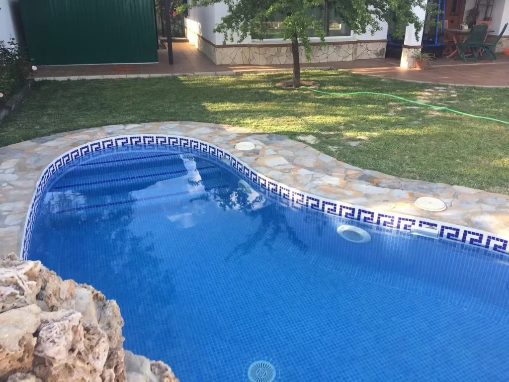 El gran patio exterior es uno de los espacios más valorados por quienes nos visitan. Más de 200 metros cuadrados con piscina, barbacoa, plancha para cocinar, cama elástica, iluminación nocturna muy cuidada y amplios espacios para comer, jugar y relajarse.